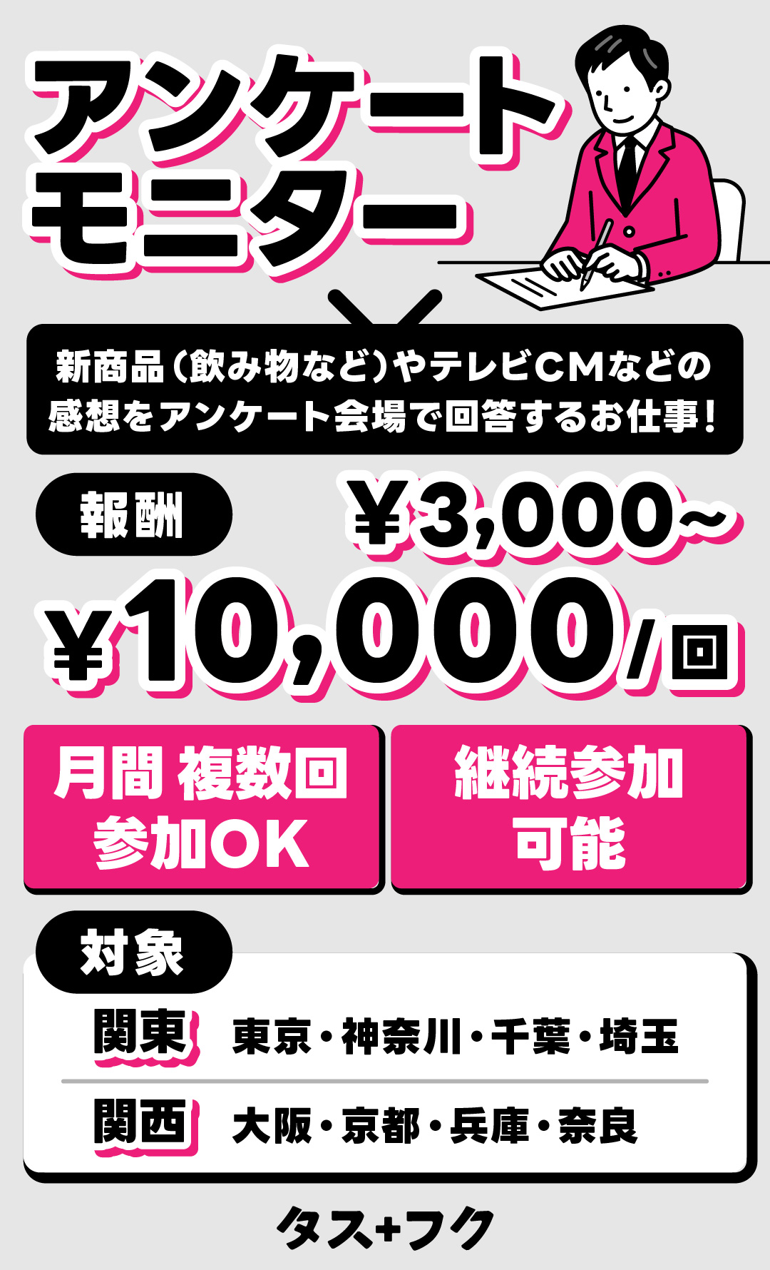 アンケートモニターのお仕事です! 大量の手書きのアンケートでは無く、参加型のモニターアンケートがメインのため楽しみながら参加できます♪ 予定が合えば月に複数回参加も可能です!